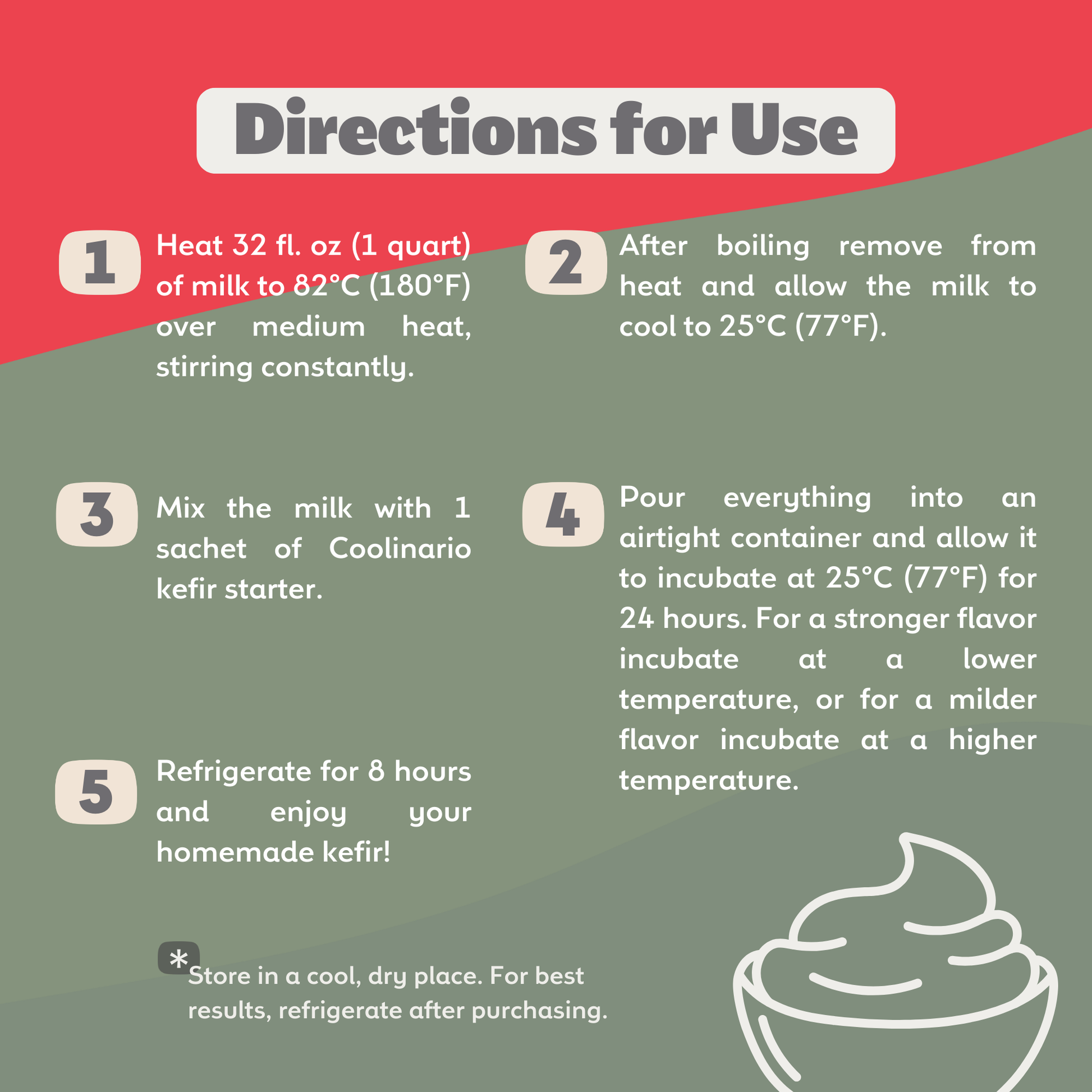 - Effortless to Make at Home: Making kefir at home is simple and rewarding. Heat 1 liter of your preferred milk to 82°C (180°F), cool to 25°C (77°F). Mix the milk with 1 sachet of Coolinario kefir starter, pour everything into an airtight container and incubate at 25°C (77°F) for 24 hours. Refrigerate for 8 hours, and enjoy fresh, creamy kefir anytime!